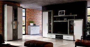 Гостиная Инстайл является частью одноименной модульной коллекции, все предметы которой идеально сочетаются между собой. Цвет бетон корпуса в комбинации с белыми матовыми фасадами и вставками из стекла придают гостиной Интсайл легкости. Два распашных шкафа, в один из которого встроена хромированная штанга, позволят разместить личные вещи и предметы гардероба. На нескольких открытых полках вы сможете хранить сувениры, фотографии или предметы декора.