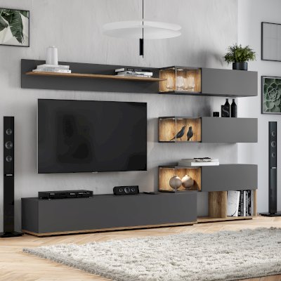 Гостиная "Рига" - это сочетание четких геометрических линий и трендовых оттенков. Строгий дизайн гостиной дополняет нестандартная деталь - полки "аквариумы" из прозрачного стекла, в них можно выставить красивые элементы интерьера или небольшие светильники для дополнительного уюта в вашем доме.