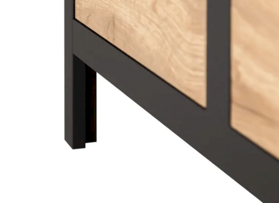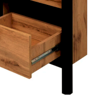 3 отделения: 1 выдвижной ящик на металлических  направляющих, открытое отделение и отделение за распашной глухой дверью. Матовая декоративная планка имитирует металл. Высокие ножки - это стильно и функционально. Ярко выраженная древесная текстура