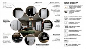 Мишель – это современная спальня с лаконичными формами и строгой геометрией в актуальных природных цветах. Оригинальная конструкция основания в сочетании со светодиодной подсветкой создают «эффект парения». Накладные светильники в комбинированном изголовье дают дополнительное освещение в ночное время, а мягкая накладка с вертикальной отстрочкой поддержит спину во время отдыха. Отсутствие лицевой фурнитуры в ящиках и комодах подчеркивают минималистичный дизайн спальни, а контрастные ручки шкафов оттеняют белизну фасадов.