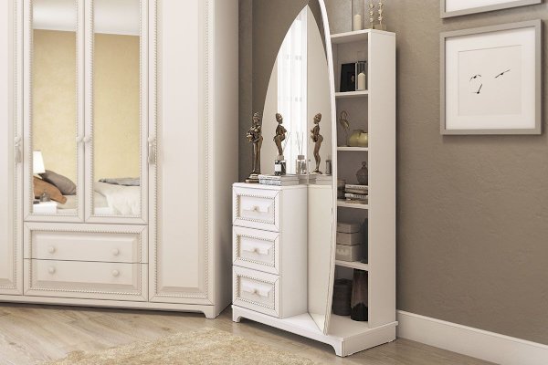 Шкаф совмещает в себе как функционал трюмо, так и вместительного шкафа. Множество скрытых зеркалом полок позволит хранить в нем максимальное количество вещей и аксессуаров. Столешницу из МДФ украшает фрезеровка. На фасады выдвижных ящиков нанесен фрезерованный рисунок. Дверца с зеркалом оснащена доводчиками, благодаря которым закрывается бесшумно.