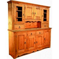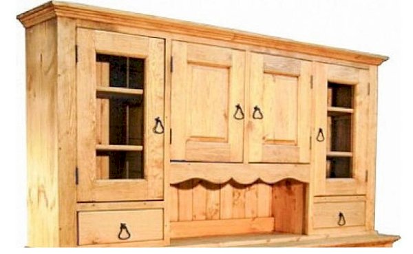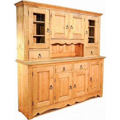 Комплект из нижней тумбы и верхнего буфета выполнен в стиле Прованс. В нижней части отлично разместятся соленья-варенья, посуда и скатерти. За стеклянными дверцами можно хранить праздничные сервизы, семейные раритеты, интерьерные вещицы. Задние стенки всех буфетов набраны из дощечек массива сосны. Также из массива сосны набраны днища ящиков. В конструкции нет элементов из фанеры, ДСП, или МДФ.
