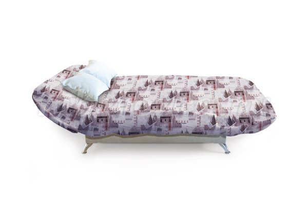 Дизайн дивана-кровати отличается оригинальностью, а также имеет съемный стеганый чехол, который по мере загрязнения можно постирать. В качестве обивочного материала для съемного чехла подойдет цветная качественная ткань: флок, терможаккард и другие.