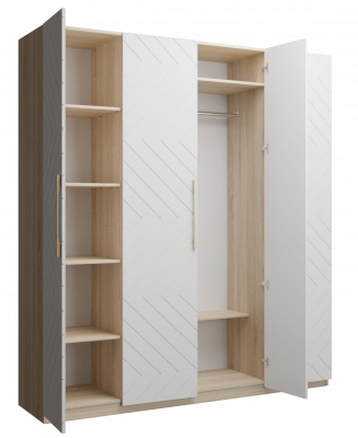 Шкаф для спальни или гостиной имеет важное практическое значение. Данная модель оснащена 4-мя распашными створками, за которыми скрыто 3 отделения: 2 боковых с вместительными полками под сложенную одежду или белье, центральное с 2-мя полками и штангой для одежды на плечиках.