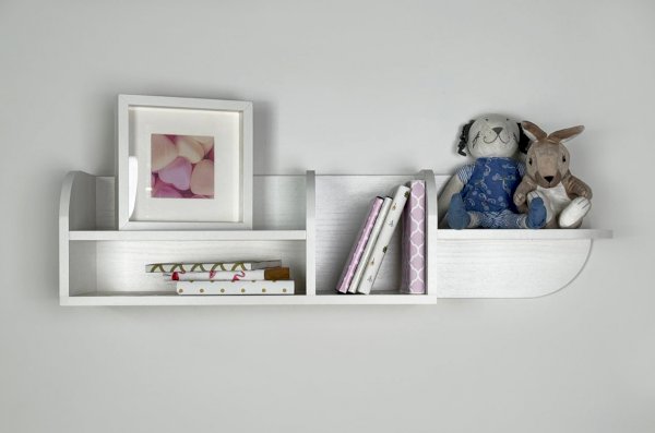 Полка состоит из прочного ЛДСП и имеет две открытые секции, которые удобно использовать для книг, игрушек, декора или учебных принадлежностей. Закруглённые боковые элементы придают конструкции мягкий, безопасный внешний вид, что особенно важно для детской комнаты.