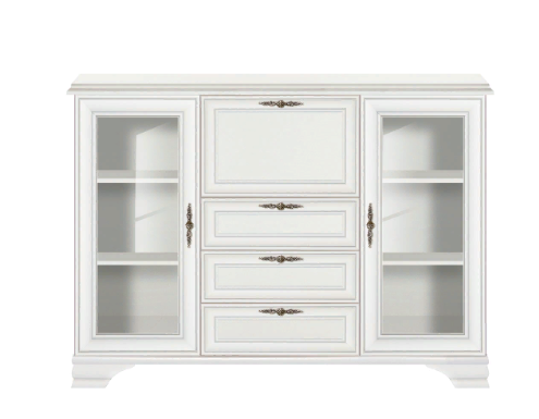По бокам – два застекленных отделения с прозрачными дверцами и стеклянными полками внутри.