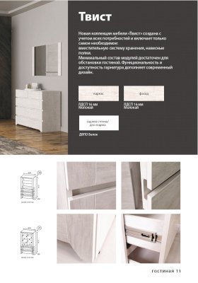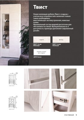 Мебель из коллекции Твист, выполненная в современном стиле, станет украшением Вашей гостиной. Коллекция представлена разнообразием модулей, комбинируя которые между собой Вы сможете не только создать неповторимый уют в комнате, но и с комфортом разместить все Ваши вещи.