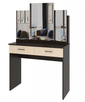 Столик туалетный с 2-мя ящиками на роликовых направляющих с задней надстройкой. Боковые зеркала поворотные, на карточной петле.