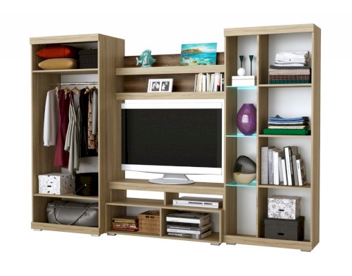 В гостиной Соната применяются современные европейские декоры: корпус выполнен из ЛДСП Дуб сонома, фасад из ЛДСП Белый глянец. Декоры отличаются выраженной тёплой древесной текстурой, а фасадная часть подчёркнута горизонтальными линиями текстуры и стильными планками МДФ, представляющими собой элементы корпуса и фасада.