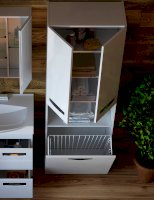 2 дверцы; 1 ящик с бельевой корзиной; 2 полки ЛДСП; ручка врезная металлическая хромированная.