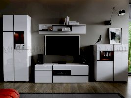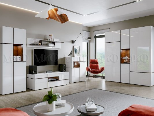 Подсветка Глянцевая белоснежная гостиная делает комнату просторнее и светлее. Яркое тому подтверждение гостиная «Мадера». Любой предмет мебели в такой гостиной можно использовать как самостоятельную единицу, так как она подойдет к любому интерьеру. С помощью гостиной «Мадера» можно создать свой стиль в обстановке квартиры.