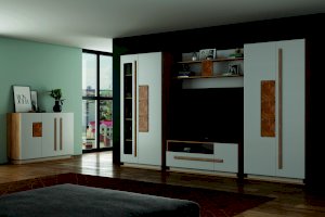 Отсутствует привычная лицевая фурнитуры в виде ручек. Функцию ручки выполняет профиль МДФ, окутанный в пленку ПВХ, собственного производства. Фигурная фрезеровка на фасадах повторяет контур ручки, что придает дополнительную фактуру и рельеф внешнему виду модуля.