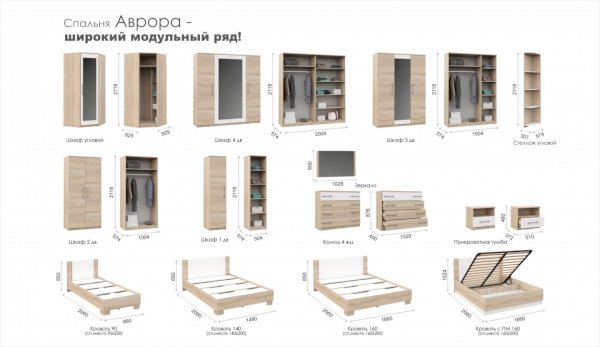 Аврора – это ХИТ продаж в Европе! Спальня выполнена в современном европейском стиле. Благодаря нейтральным оттенкам мебели, Вы сможете создать яркий и функциональный интерьер, отражающий ваши вкусы и предпочтения. 5 вариантов шкафов с вместительными полками и качественной фурнитурой позволяют создать полноценную систему для хранения. При создании спальни Аврора реализованы в полной мере «зеленые» принципы, которые напрямую влияют на экологичность мебели и соответственно на качество сна и наше здоровье. Система выполнена из высококачественных материалов.
