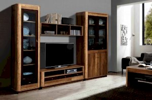 Тумба предназначена под ТВ либо любую другую технику. На верхней панели можно расположить очень многое: телевизор, стереосистему, проигрыватель. Под столешницей находятся два открытых отсека, а под ними – три закрытых выдвижных ящика. Внешне применен принцип асимметрии: три ящика под двумя полками. Такой прием делает дизайн более интересным и нестереотипным.