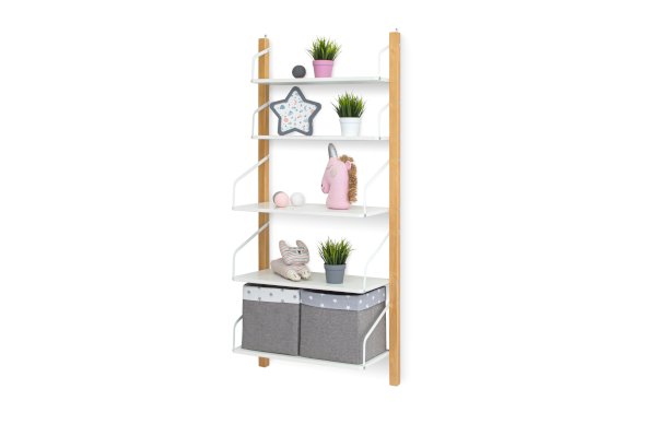Конструкция детского стеллажа навесная и крепится к стене с помощью двух надежных металлических мебельных навесов. Стеллаж состоит из 5 полок. Высокопрочная конструкция стеллажа позволяет выдержать нагрузку на одну полку до 10 кг.