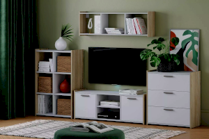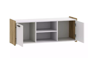 Тумба ТВА Симпл выполнена в скандинавском стиле и имеет малые габариты, что делает ее функциональной и стильной. Характерная особенность тумбы - комбинация открытых полок и ящиков. На полках можно разместить предметы декора и книги, а в ящиках за распашными дверями расположить все необходимые мелочи.
