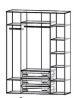 Компактный, но вместительный распашной шкаф с тремя ящиками, за дверью полки для одежды и белья. Вместительные выдвижные ящики полного выдвижения глубиной 400 мм. В двух секциях штанга под одежду.