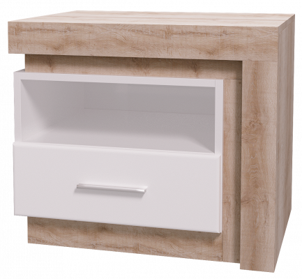 - Коллекция представлена в следующем цветовом решении: Корпус ЛДСП 16 мм  в декоре «Дуб Сакраменто» и фасад МДФ 16 мм в декоре  «Белый снег глянец»