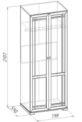 В распашном платяном шкафу со стационарной штангой для одежды длиной 757 мм можно разместить до 10 плечиков с тяжелой верхней одеждой. На верхней полке можно хранить аксессуары и коробки с головными уборами.