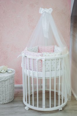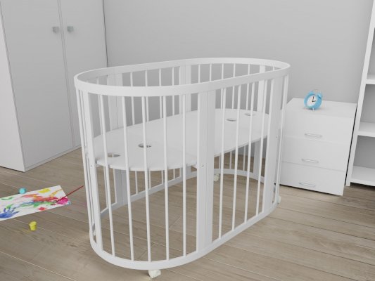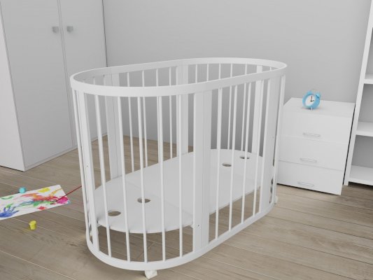 - Овальная кроватка. Длину кроватки можно корректировать относительно роста ребенка. Это сделает покупку долговечной и избавит от необходимости покупать малышу новую кровать как минимум на пять лет вперед. Размеры овальной кроватки 78*128 см. Для овальной кроватки вы можете приобрести дополнительно овальный матрас