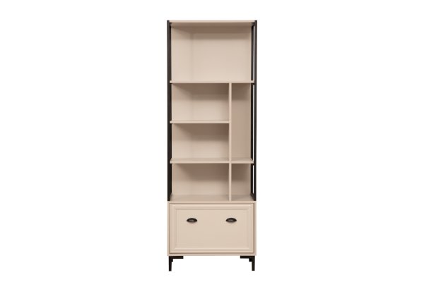 Корпус стеллажа выполнен из ЛДСП и металлического профиля. Металлическая ручка-ракушка с матовой поверхностью проста в установке, надежна и удобна в использовании, и к тому же, имеет прекрасный внешний вид. Фасады вкладные с рамочным профилем собственного производства. Опоры стеллажа визуально неотличимы от металлических, но выполнены из пластика, что облегчает вес модуля в целом.