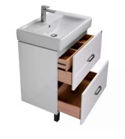 Современная лаконичная модель тумбы AQUATON Америна 70 Н шириной 70 см с двумя внешними ящиками и одним встроенным выполнена в белоснежном глянцевом цвете. Корпус изготовлен из влагостойкой ЛДСП, а фасад - из высококачественной МДФ. Тумбы данной модификации устанавливаются на ножки. Направляющие нижнего крепежа обеспечивают жесткое и надежное крепление ящиков, а встроенные доводчики гарантируют их бесшумное и плавное закрывание. Дополнительно организовано нижнее подключение труб водоснабжения и канализации. Корпус и фасады покрыты полиэфирной краской ультрафиолетового отверждения, обеспечивающей дополнительную защиту от влаги.