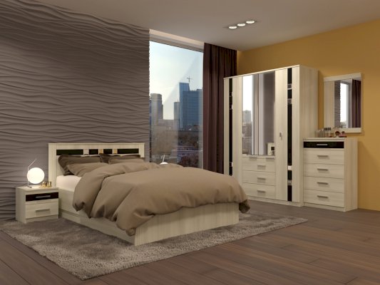 Спальный гарнитур Николь благодаря белому цвету выглядит воздушным и современным. Черное стекло и зеркала добавляют контраст и изящество.