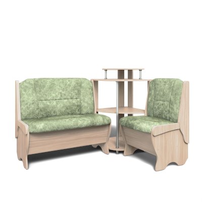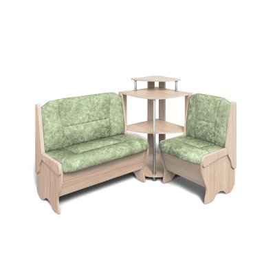 Оригинальный кухонный уголок Лотос отличается от других похожих кухонных гарнитуров. Он состоит из двух отдельных диванчиков и этажерки, заменяющей угловую мягкую часть.