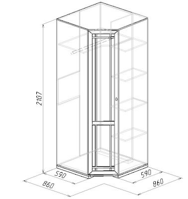 Используйте углы в комнате рационально! Угловой шкаф оснащен стационарной штангой длиной 81 см, полочками для белья и автоматической подсветкой, которая включается, если шкаф открыт. Фасад углового шкафа изготавливается только в исполнении «левый» (определяется по расположению петель). По своим габаритам угловой шкаф подходит для компоновок глубиной 590 мм.