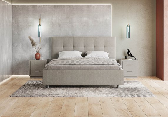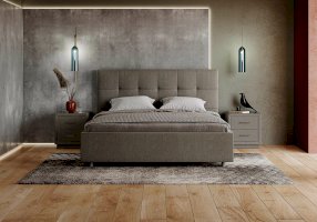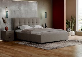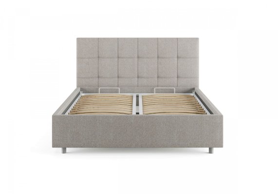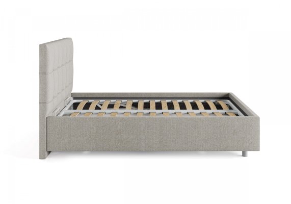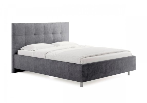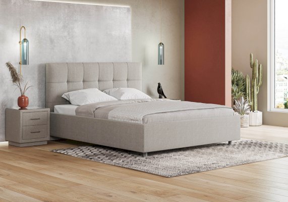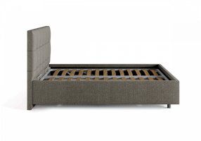Лаконичная интерьерная кровать с изголовьем, украшенным декоративной строчкой. Модель изготовлена из ДСП. Обратная сторона изголовья обита темно-серым спандбондом, но, при желании, её можно выполнить из основного обивочного материала. В комплект кровати входит кроватное основание. Каркас основания выполнен из металла, ламели - из берёзы. При необходимости в комплект можно включить подъемный механизм с бельевым ящиком, который существенно увеличит объем хранения вещей, а так же позволит легко производить уборку пыли под кроватью.