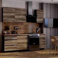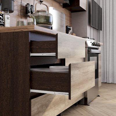 Кухня "Энигма" - это стильная модель, дизайн которой вдохновлен самой природой. Оттенки "дуб каньон" и "венге" выглядят очень натурально, словно созданы из настоящего дерева. Интегрированные срезы на фасадах заменяют традиционные ручки, они обеспечивают удобный захват, а также придают гарнитуру монолитный вид.