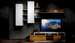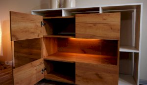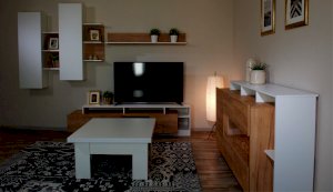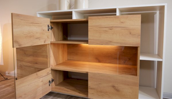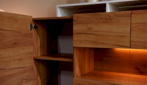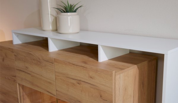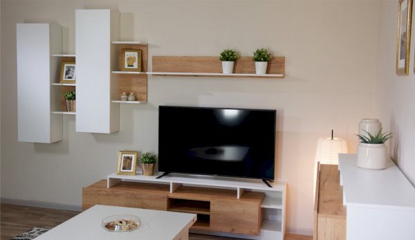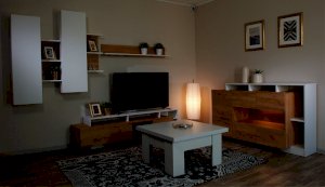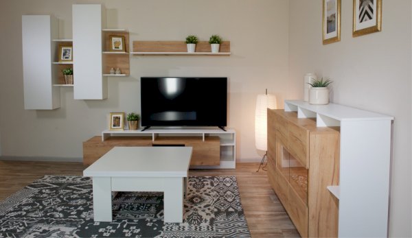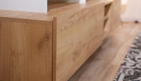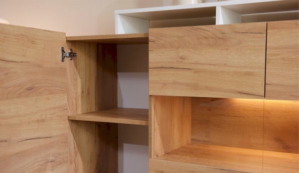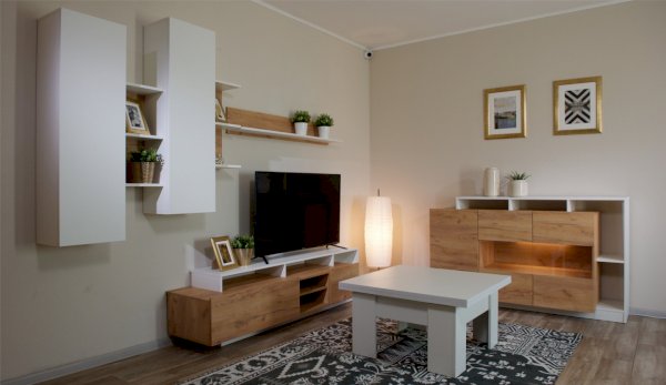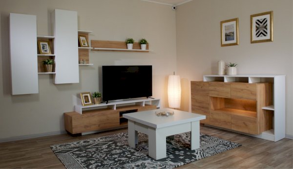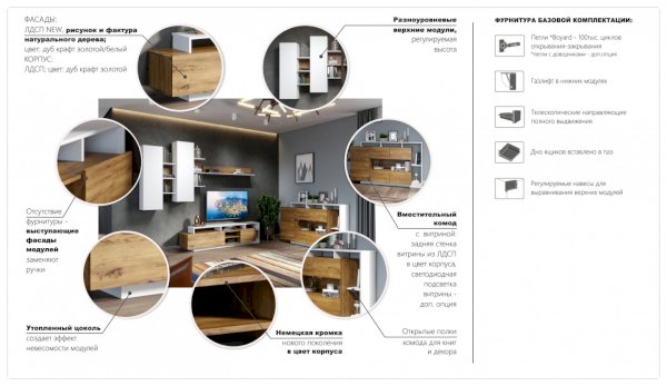 Стенка Невио-2 выполнена с использованием новейшего декора «Дуб крафт золотой» в сочетании с белым - подходит для стилистических направлений лофт, минимализм, скандинавский. Простые формы, естественные природные оттенки создают гармоничную и умиротворенную атмосферу гостиной. Четкая текстура дерева, белый цвет, отсутствие внешней фурнитуры, углубленный цоколь - создают визуальную легкость и компактность стенки. Фасады, выступающие на 1см поверх корпуса, заменяют ручки. Стенку дополняет вместительный комод с витриной. Мебель выполнена из высококачественных экологичных материалов.