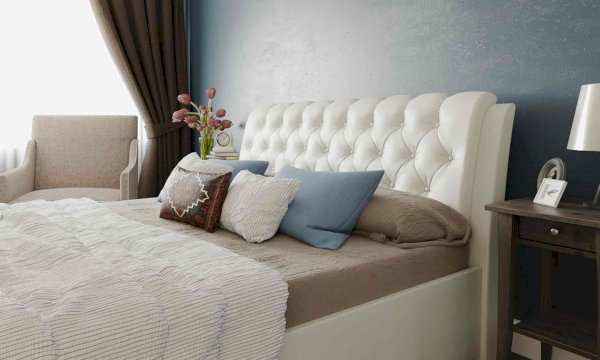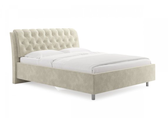 Элегантная интерьерная кровать с изголовьем, украшенным декоративными пуговицами и глубокой пиковкой. Модель изготовлена из ДСП. В комплект кровати входит кроватное основание. Каркас основания выполнен из металла, ламели - из берёзы. При необходимости в комплект можно включить подъемный механизм с бельевым ящиком. Обратная сторона изголовья обита темно-серым спандбондом, но, при желании, её можно выполнить из основного обивочного материала.