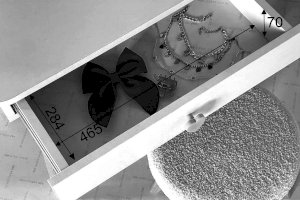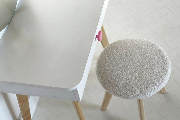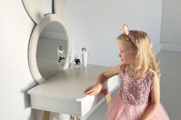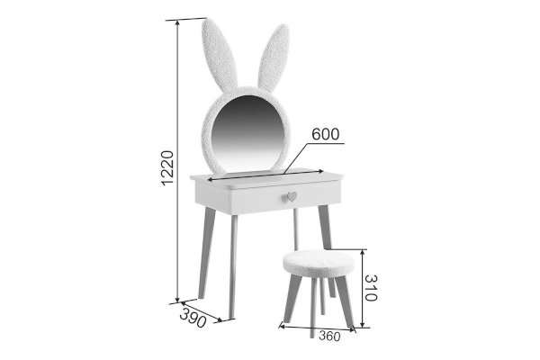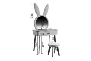 Комплект многофункционален: девочка может наводить красоту, смотрясь в круглое зеркало, мягкие уши из плюша можно использовать как крючки для украшений, на столешнице разложить все нужные и важные вещи для марафета или лепить из пластилина и рисовать. В выдвижной ящик на шариковых направляющих складывать необходимые вещи. Тактильно приятная на ощупь ручка в форме сердечка, ни кого не оставит равнодушным, к ней захочется прикасаться все снова и снова.