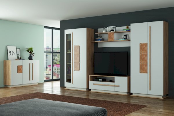 Отсутствует привычная лицевая фурнитуры в виде ручек. Функцию ручки выполняет профиль МДФ, окутанный в пленку ПВХ, собственного производства. Фигурная фрезеровка на фасадах повторяет контур ручки, что придает дополнительную фактуру и рельеф внешнему виду модуля.