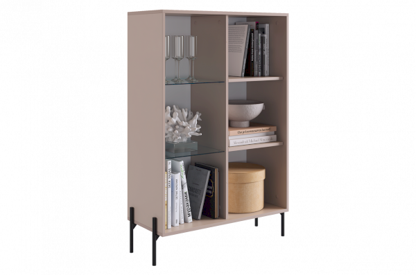 Другая сторона комода оснащена выкатным ящиком и фасадом со стеклом, обладающим зеркальным эффектом. Это не только добавляет современности и шарма, но и обеспечивает дополнительное пространство для хранения декоративных предметов и книг.