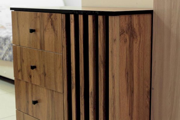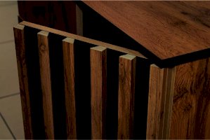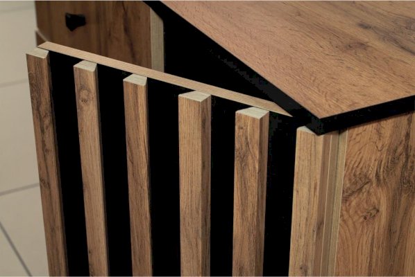 Торцы сверху и снизу покрыты черной пленкой и удачно гармонируют с реечным фасадом. Черные рамки подчеркивают границы комода. Внутренние полки и дверцы изнутри также выполнены в черном цвете. Таким образом достигается постоянный контраст, что выглядит очень эффектно!