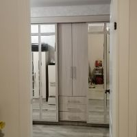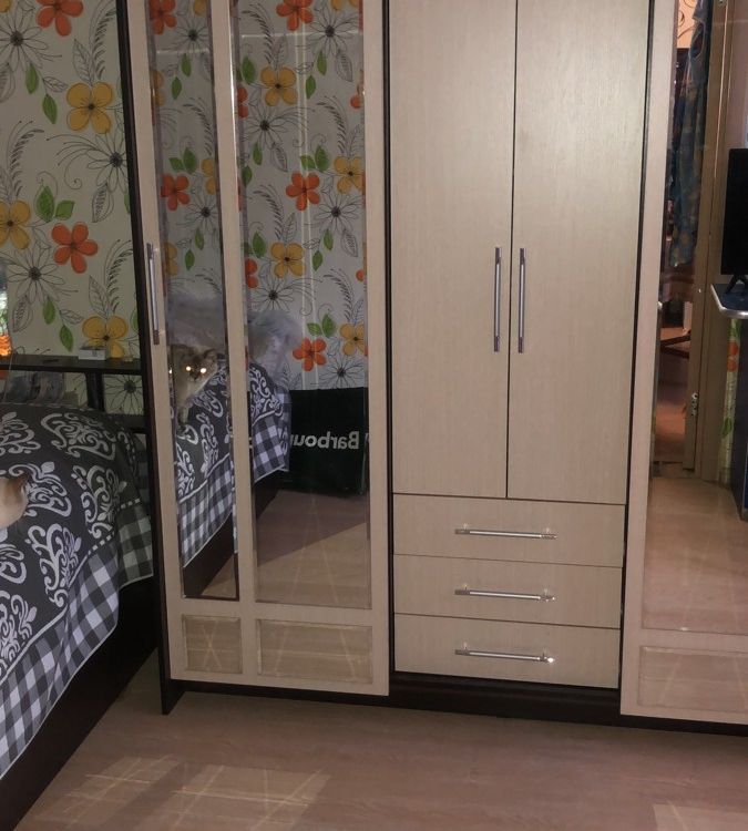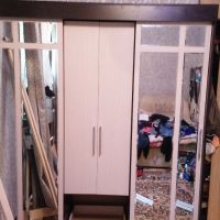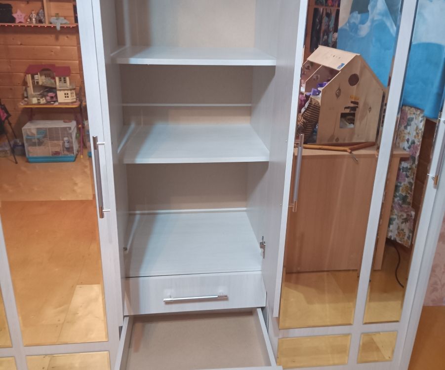 очень удобный многофункциональный шкаф купе с доп полками и выдвижными ящиками который ращделяется на три части что позволяет хранить вещи более удобнее