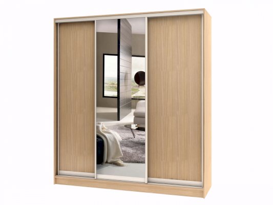 Данное изображение представлено в следующих цветах: корпус - Дуб Феррара, фасады - Дуб Феррара (2 шт.) и зеркало (1 шт.), рамка двери и треки - Серебро матовое.