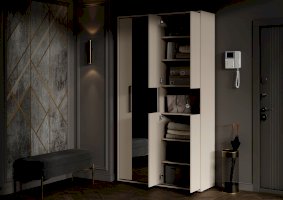 Разделение на секции: Одна часть прихожей включает две одинаковые секции с полками, закрытые створками. В каждой секции предусмотрено по две съёмные полки, что позволяет настраивать пространство под ваши нужды. Открывание створок осуществляется за выступ, что делает использование шкафа более удобным.