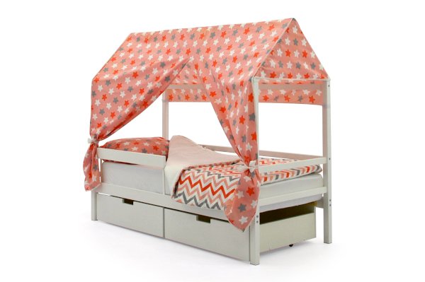 Кровать-домик легко превращается в целый замок для игр с помощью разноцветных тематических игровых накидок. Текстильная крыша на домике создаст ребенку уют и защищенное пространство.