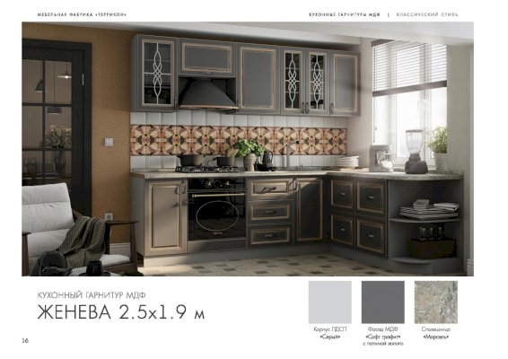 Кухонный гарнитур «Женева» превращает процесс приготовления пищи в настоящий праздник. В комплект входят все модули, необходимые для правильной организации пространства кухни. Удобная и красивая мебель вдохновляет человека на создание кулинарных шедевров. Изящные рисунки на стеклянных дверцах навесных шкафчиков наполняют классический стиль особым шармом.