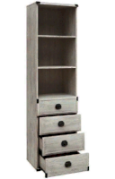 Шкаф разделен на 2 отделения: верхнее –открытое отделение с полками, нижнее – 4 выдвижных ящика на металлических роликовых направляющих