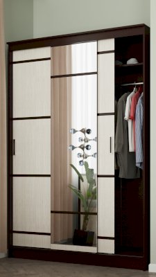 Шкаф-купе Сакура выполнен в едином стиле с остальными модулями одноимённой мебельной серии. Он сделан из ЛДСП высокого качества в комбинации цветов венге и лоредо, раздвижные дверцы декорированы темными полосами и дополнены удобными ручками, центральная створка – полностью зеркальная. Внутри модель содержит все необходимые зоны для хранения одежды и обуви: большое отделение для плечиков, а также полки и ниши для остальных вещей.