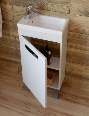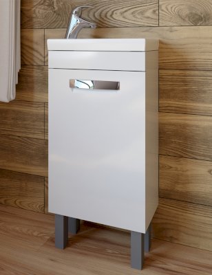 1 дверца; 1 полка ЛДСП; ручка врезная металлическая хромированная, опоры квадратные регулируемые.