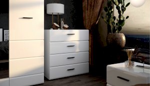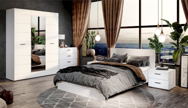 Компактный шкаф Йорк – это решение для небольшой спальни, гостиной или прихожей. Он выполнен в современном стиле – сочетает в себе функциональность и эффектный внешний вид: горизонтальная фрезеровка фасадов, контрастные черного цвета ручки и задняя стенка. Глянцевые белые фасады High Gloss из МДФ и зеркало в полный рост наполняют комнату светом, делают ее просторнее и ярче. Внутри предусмотрены секции для белья и большое отделение со штангой. Идеально компонуется со всеми модулями системы Йорк.