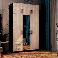Очень вместительная модель трехстворчатого шкафа с ящиками будет прекрасно смотреться в вашей спальне. Изделие состоит из нескольких зон для хранения одежды и обуви, включая два выдвижных ящика для мелких вещей, отделение для одежды на вешалках и вместительные полки. В центральную створку вставлено зеркало, что помимо основной функции, позволяет визуально расширить пространство. Сочетание тёмного корпуса и светлых фасадов позволит шкафу стать частью практически любого интерьера.