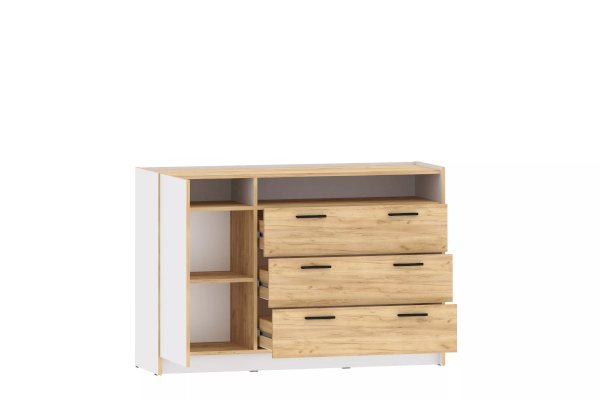 Тумба оснащена тремя выдвижными ящиками со встроенной перегородкой для удобного хранения вещей, а также распашной дверкой с полками и открытой нишей, чтобы легко расположить косметику или украшения, а также документы, если использовать тумбу в домашнем кабинете. Черные лаконичные ручки идеально контрастируют на песочном фасаде.