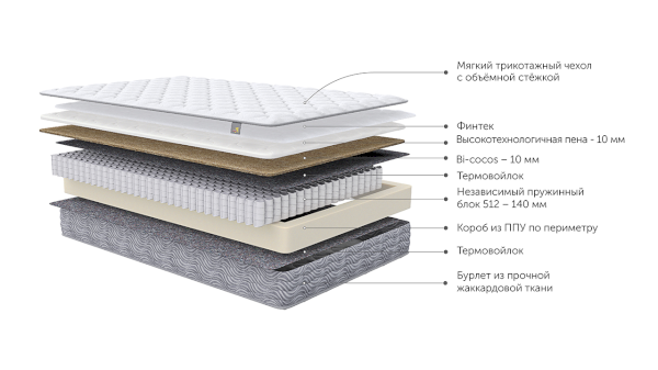 Наполнитель: Fintek, ППУ высокотехнологичный 10 мм, Bi-cocos 10 мм, Термовойлок, Независимый пружинный блок