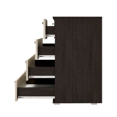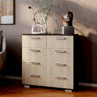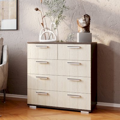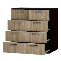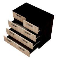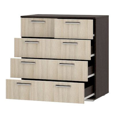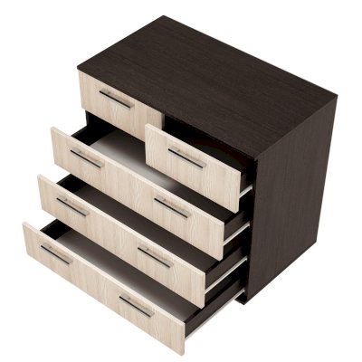 Классическая модель комода Стандарт №5 будет прекрасным выбором для любой комнаты вашей квартиры или дома. В производстве изделия используется высококачественная ЛДСП в популярных цветах венге и лоредо. Для облегчения открывания на нижних ящиках расположились сразу по две ручки геометрической формы, верхняя секция в данной модели разделена на две выдвижные части для вашего удобства.